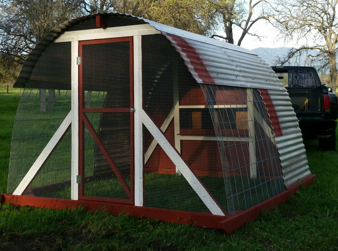 The cattle panels cost 25 99 each at tsc and measure 16 long and 50 wide. Our latest chicken coop is a hoop house style made from an old greenhouse frame with hog panel sides and salvaged tin for the front and back wall. Wire rods are welded at every intersection. Mo s cattle panel hoop coops.